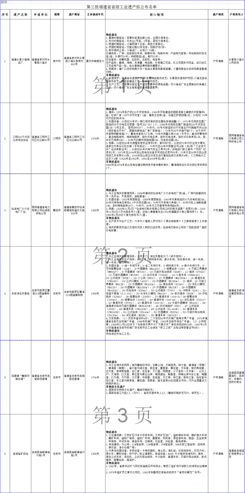 根据《国家工业遗产管理办法》(工信部政法函〔2023〕24号和《福建省工业和信息化厅乐竞在线官网(中国)官方网站征集福建省省级工业遗产的通知》(闽工信函服务〔2025〕88号)要求,经地市申报、材料初审、专家评审等程序,现将第三批福建省省级工业遗产拟公布名单予以公示。公示期内如有异议,请以书面形式向福建省工信厅提出,并提供必要的佐证材料。